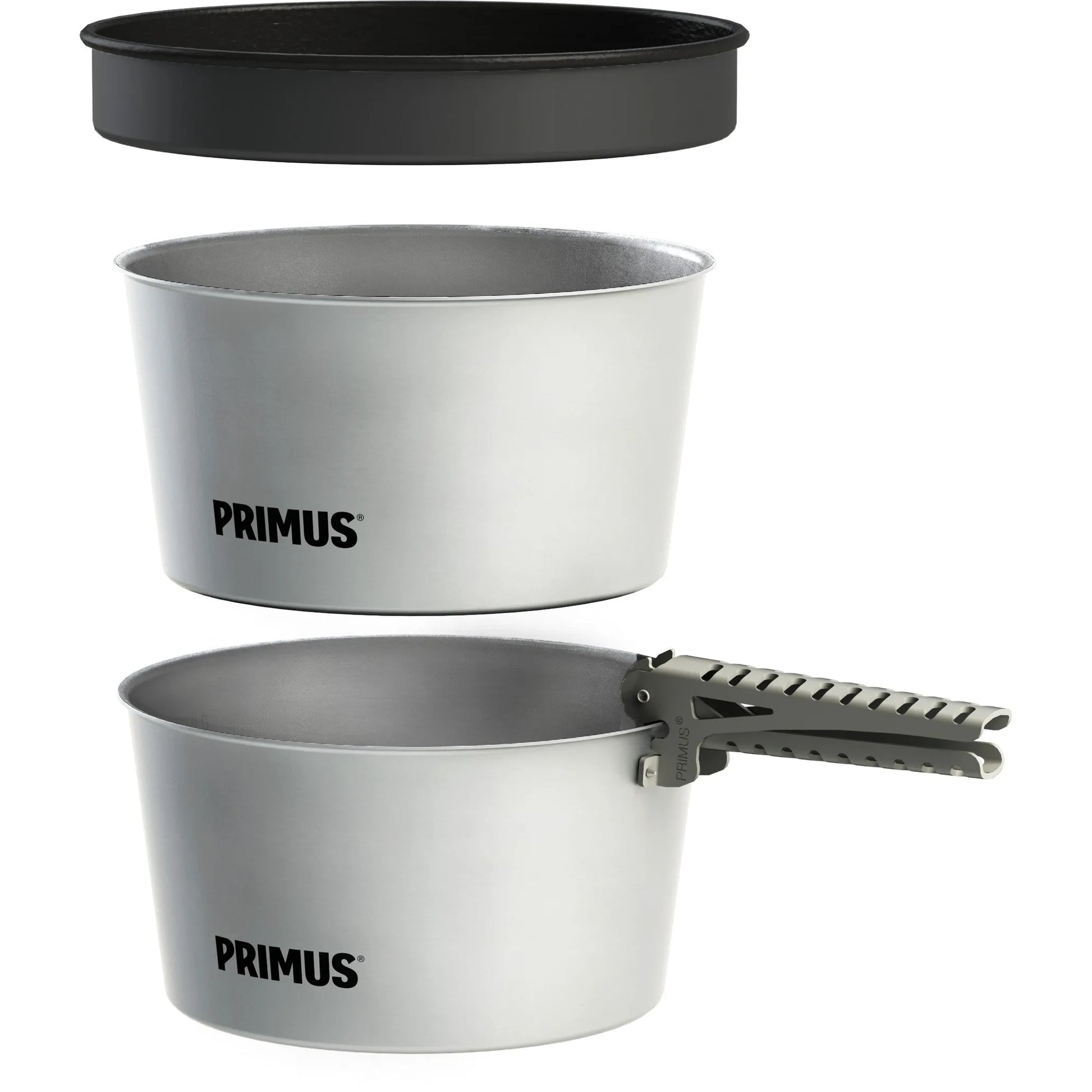 Essential Pot Set 2.3L från Primus är ett set med två kastruller, en stekpanna och en griptång som passar perfekt för dig som vill börja laga mer mat ute i naturen. Kastrullerna och stekpannan packas smidigt i varandra för att bilda en enda enhet som tar lite plats i packningen. Setet är lagom för matlagning till 2-5 personer. Båda kastrullerna är tillverkade i aluminium, ett lätt material som dessutom sprider värme riktigt bra. Stekpannan i hårdanodiserad aluminium med non-stick-beläggning fungerar även som lock till kastrullerna.
